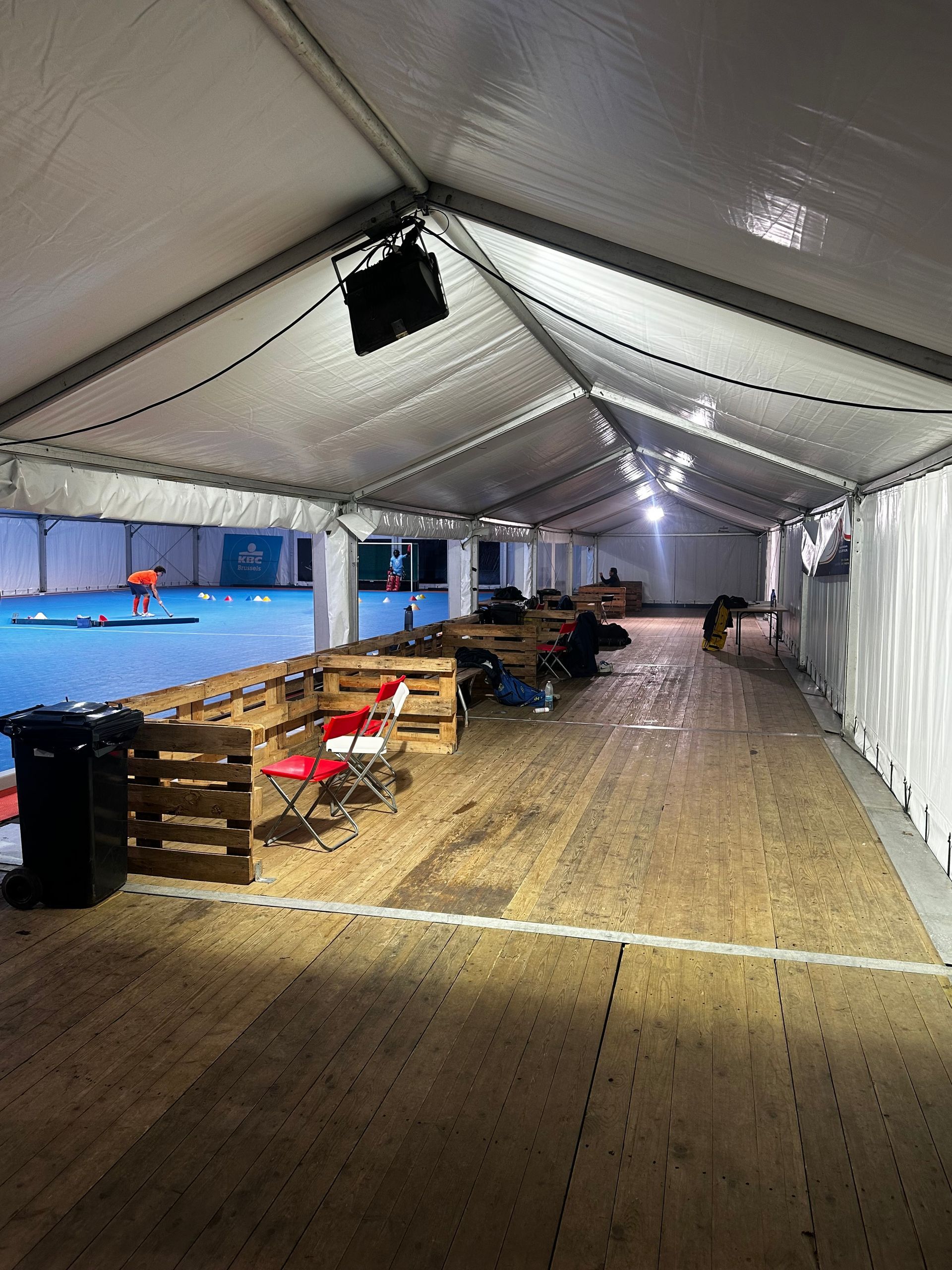 Royal Leopold, a large hockey, padel and tennis club have added a single marquee across tennis courts at the front of their clubhouse. You'll see they have added a simple sectioned area using wooden pallets at the side of the pitch for team benches and a technical area.