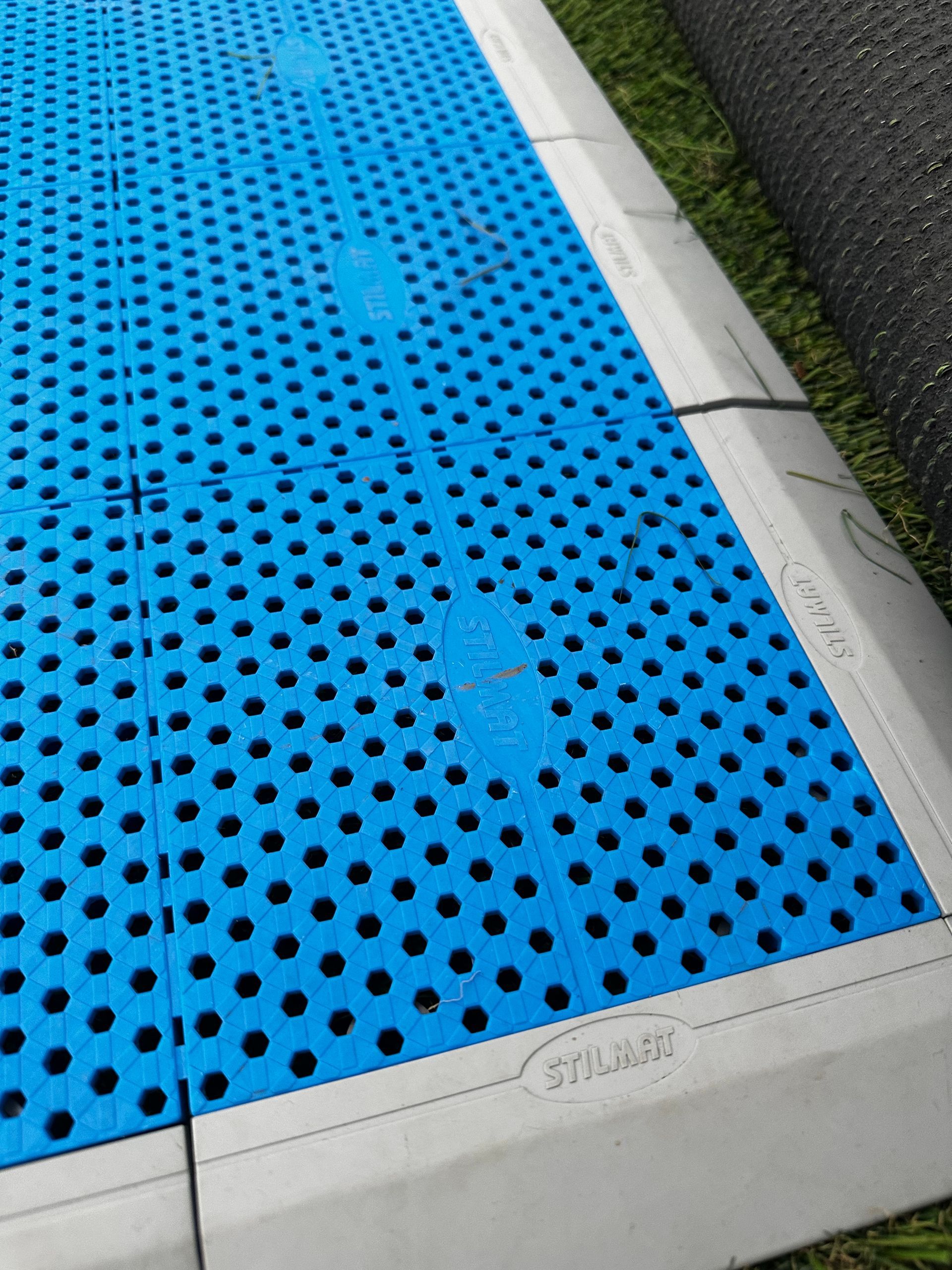 The floor is made by a company called Stilmat. Originally, an 'inline hockey' accessory, the run of the ball and performance of the slightly sprung floor is excellent for indoor hockey. The floor can be hired or bought. The lighting system is also hired.